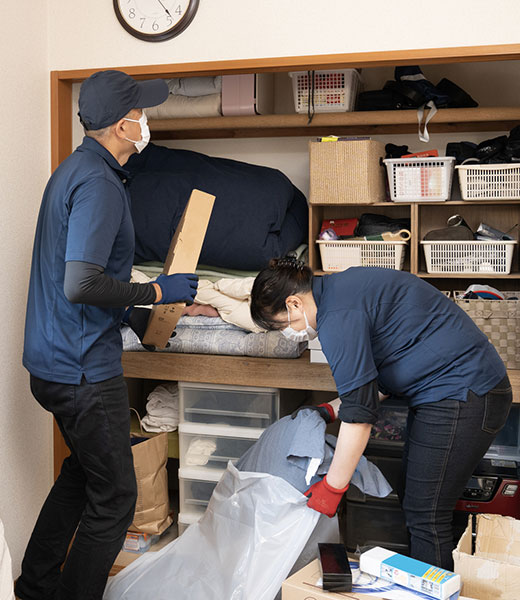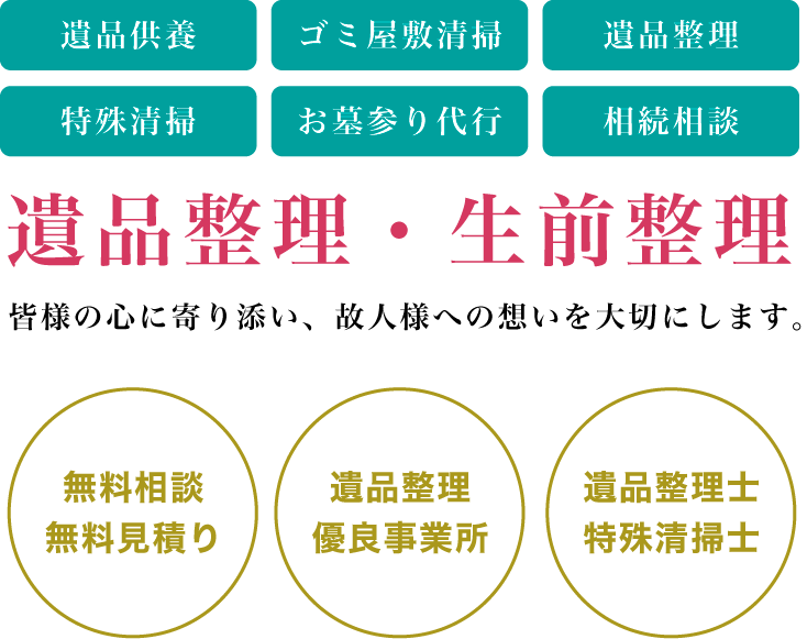 私たちは福岡県久留米市を中心に、遺品整理・生前整理・特殊清掃を行う専門チームです。ご依頼者様の想いに寄り添い、不安やご負担を少しでも軽くできるよう、心を込めてお手伝いします。